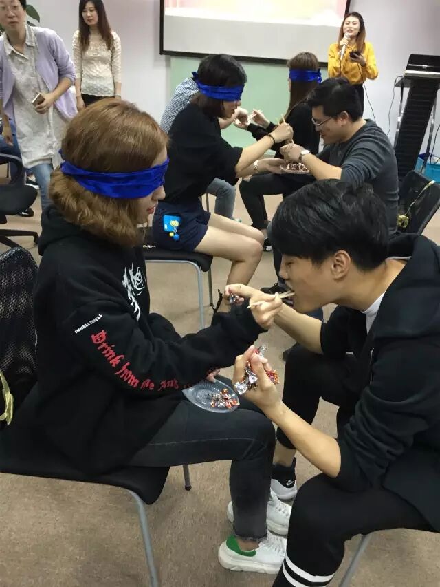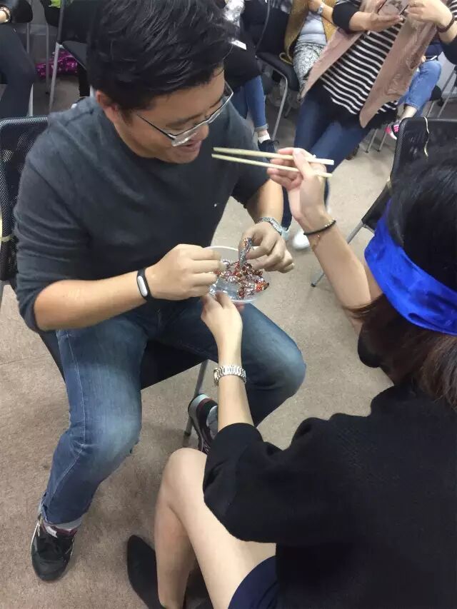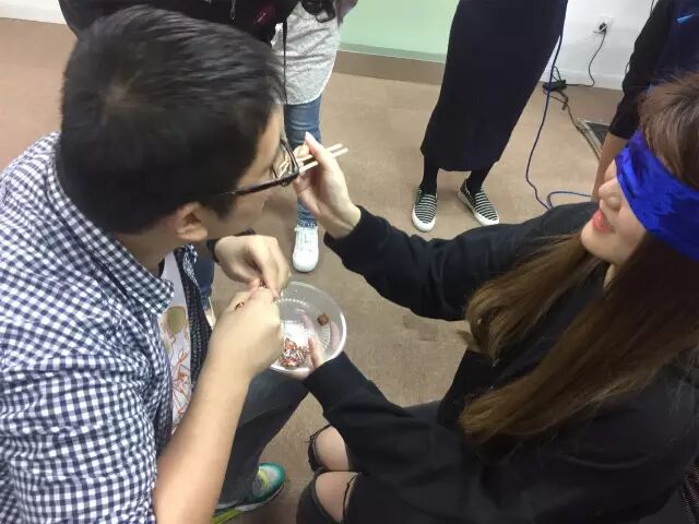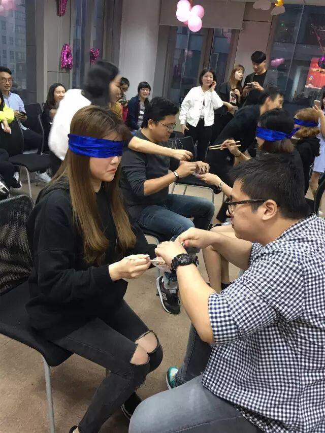 “蒙眼喂食”游戏就热闹了,美女寿星们各自邀请了男搭档,亲手喂他们吃牛肉粒,多么贴心和浪漫!