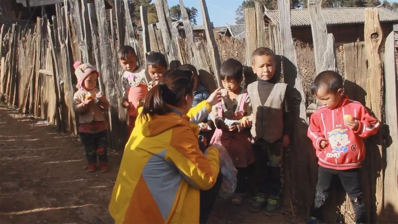 归途遇到放学的孩子们,项目总监范权把充饥的巧克力分给他们